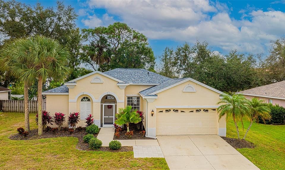 Come see this lovely River Pointe 3-bedroom, 2-bath POOL home that has been impeccably maintained and is awaiting its new owners! Comfortably live in 1550 sf of living area with a split plan featuring a Living and Dining Room, Breakfast Nook and the air-conditioned convenience of an indoor Laundry Room. Water views are everywhere! Enter the caged screened door entry — perfect for cooler nights and fresh air — through the foyer and see the sparkling swimming pool surrounded by a private fenced in backyard. A small lake is positioned right across the the street so that you can enjoy more water views of the ducks, egrets, and natural Florida waterfowl with the added privacy of no neighbors in front. Picture yourself preparing meals in your kitchen featuring newer stainless steel upgraded Kitchen-Aid appliances, solid wood cabinets, canister lighting, gorgeous granite countertops, a walk-in pantry closet and a barstool breakfast counter area. Entertaining will be a pleasure as family and friends relax and sunbathe in the pool. The Primary Retreat includes an ensuite bathroom and a LARGE walk-in closet, with a new sliding glass door for pool and patio access. Extras include PVC and wood fencing, 1-year-old interior and exterior painted, blinds, textured volume ceilings, tile and laminate flooring, 2022 roof, 2023 water heater, lamp post lighting, hurricane-rated windows and a hurricane enforced roof. This home also boasts the additional luxury of being elevated. Add to all of this ... and you even have the bonus of walking distance to a private community neighborhood boat ramp. Pet-friendly with no CDD taxes and low HOA fees of $50 month. Don't miss this one—it will go fast!