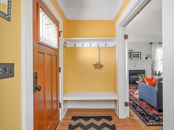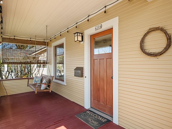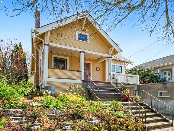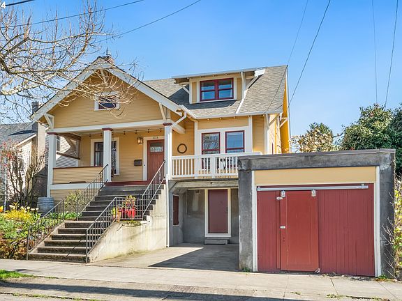 Framed by a full front porch complete with porch swing, this incredibly special craftsman home blends a renovated old Portland house-hug with a gob-smacking upstairs primary suite. The foyer opens to the spacious living room with a window nook, built-ins and gas fireplace. The kitchen is a sunny vintage delight with old school yellow subway tile backsplash and hex tile counters that connects to the light filled dining room with 2 doors that open to the lush backyard with intentional and intimate spaces, native plantings, beautiful hardscaping, and a chicken playground. The 2 main floor bedrooms are roomy with huge windows including a built in window seat facing west in the front bedroom. An unassuming door off the hallway opens to a whimsical staircase with each stair step a slow reveal to a magical primary suite. Be inspired by the soaring 13' vaulted ceilings, windows with views on four sides, a sitting area, office nook with city views, coffee station, spacious closets and artistic flair in unexpected places. With heated tile floors, a skylight, soaking tub, and gorgeous shower, the ensuite bathroom is a slice of heaven. The nearly 1200sf basement has 7' ceilings and exterior entries on the front and back of the house. The basement door on the front opens to an off street parking spot making it a perfect set-up for a future ADU and more, plus a detached garage for more storage or parking a car. The house has thoughtful upgrades with energy efficiency in mind and all systems and mechanics- electrical, plumbing, sewer, 2 tankless water heaters, HVAC, decommissioned oil tank, newer roof, interior and exterior paint and and a solid foundation bolted to the house means all the heavy lifting is done. Located just a block away from hot spots on Gladstone to the north and Grout Elementary and Kenilworth park to the south and a few skips to Trader Joe's to the east this incredible house is peerless.