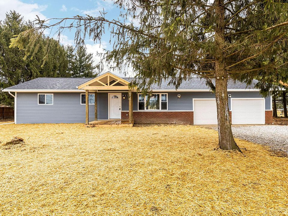 Move in ready! Totally renovated ranch home. All new septic, well, pump, HWT, pressure tank & plumbing. 2 new baths, kitchen doors, flooring, paint. New front porch, new roof, siding, windows & HVAC. sgft is incorrect on auditor, with basement its 2464. Over sized 2 car garage, great wooded yard in need of tlc. Large family room in finished basement w/4th bedroom if you wish.