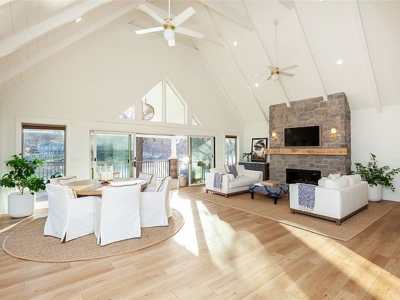 The SW facing Living and Dining Area with 20 ft vaulted ceiling features wall to wall windows and doors. New Stone Fireplace with Mantle cut from the property, new ceiling beams, shiplap and flooring capture relaxed sophistication.