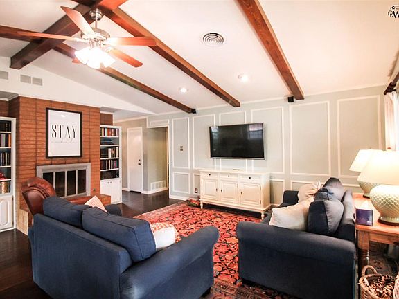 Incredible 3/2/2 Fountain Park home with generous updates. Main living area features hand scraped engineered hardwood, vaulted ceiling, and fireplace. Kitchen has granite, quality appliances, and subway tile backsplash. Master bedroom has his/her closets and a beautiful private bathroom with marble vanity tops, tile, and rain head shower. 2 other spacious bedrooms share a recently remodeled hall bath. Fabulous covered patio with TV. Flat safe storm shelter, sprinkler system, recent windows, privacy fenced.