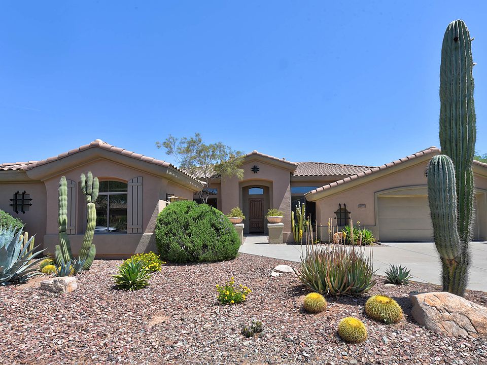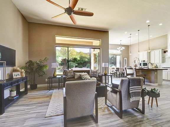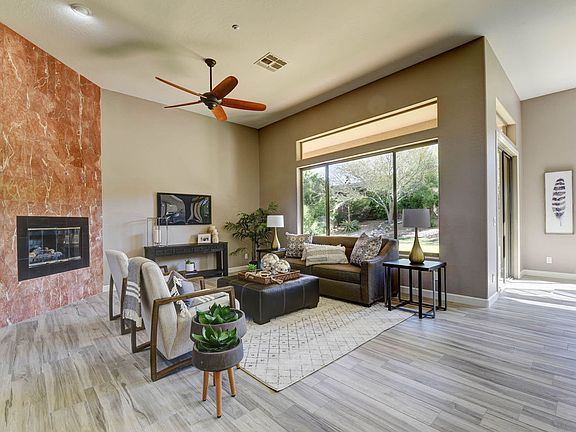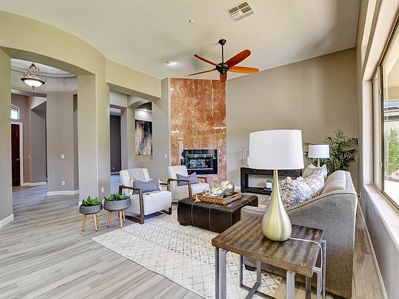 Anthem Country Club living with sought after split floor plan w/dramatic 12' flat ceilings. Extensive 2019 remodel includes grey plank style tile and all new carpet, high profile baseboards, all bathroom raised vanity cabinets - self closing, quartz counters, under mount sinks, faucets, mirrors, toilets, professionally finished kitchen cabinets, stainless dishwasher, interior & exterior paint, satin nickel door hardware & hinges, LED light bulbs and garage epoxy. Other sought after features include: kitchen slab granite counters, double stainless ovens, gas cook top, kitchen pull-out drawers, family room gas fireplace, master walk-in shower and N/S exposure.