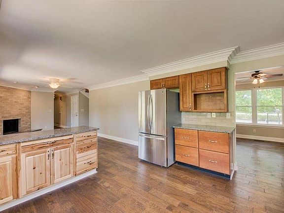 Wood burning fireplaceBackyard with woodsGranite kitchen countersLarge open basement area