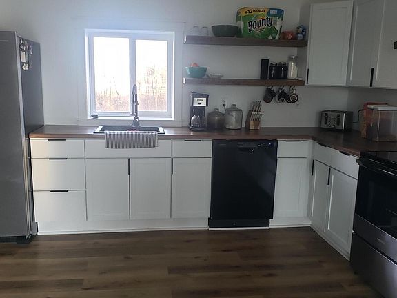 5 acres, updated 1 1/2 story with large open new kitchen with vaulted ceiling's. Large great room with nice views. 1st floor primary bedroom with new walk-in shower. Front area off great room makes for nice office or kids area. Upstairs offers 2 more bedrooms 1/2 bath along with a family area for kids. Off the kitchen is a large storage/mud/ backroom which leads to a 23x36 barn and a 8x10 shed. 5 beautiful acres, a must see for the growing family. Home features wood or furnace for heat. New 16x16 patio -2024.