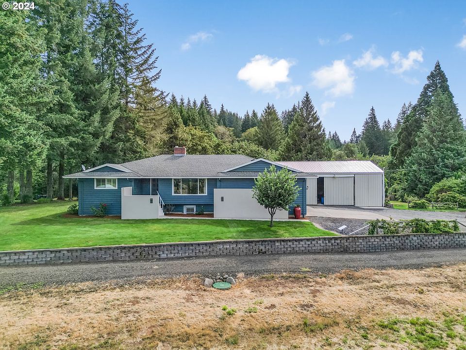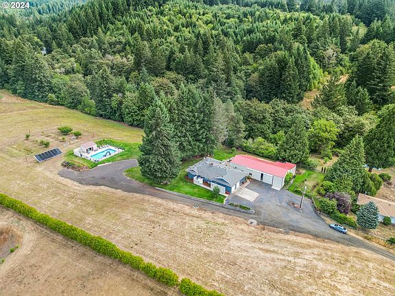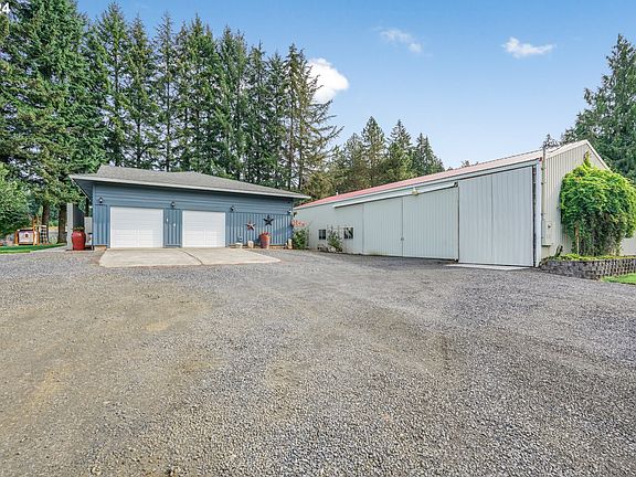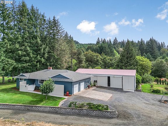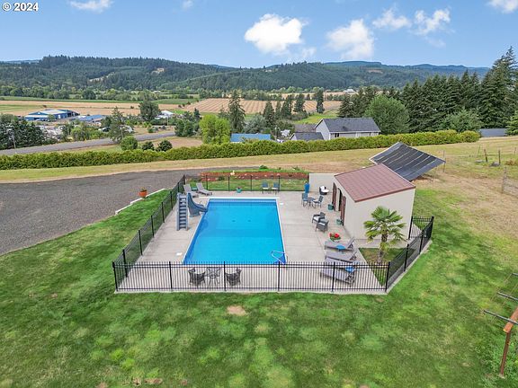 This stunning custom home sits on 4.88 acres of resort-like grounds offering breathtaking mountain and territorial views from both the house and the pool and is perfect for multi-generational living. Step inside to discover beautiful hardwood floors throughout the main living areas, enhancing the open-concept design. The living room has a large picture window framing those magnificent views. The gourmet kitchen features granite countertops, stainless steel appliances, a warming drawer, dual dishwasher, island, and a pantry. The adjacent dining area, with sliders to the deck, makes indoor-outdoor living a breeze. The main level also includes a primary bedroom with a private bath with dual sinks, plus two additional bedrooms, all with new carpet, a full bath, and a convenient office. The laundry room, equipped with a half bath and an exterior door, doubles as a mudroom. The lower level of the home is a fully-permitted apartment, perfect for multi-generational living or rental income. This space includes two bedrooms with walk-in closets, a full bathroom, a fully-equipped kitchen, a dry sauna, and a private entrance option. Outside, you’ll feel like you're at a resort with a fenced-in, built-in pool featuring a slide and a pool house complete with a bathroom. The pool is heated via solar panels, ensuring energy efficiency. The property also has a fenced orchard area, an open yard with lush green grass, berry bushes, and a sprinkler system with drip lines. For the hobbyist or entrepreneur, the large 2423 sqft 3-bay shop is a dream come true. It features a wood-burning stove, cook stove, refrigerator, 30 amp hookup in the second bay, and a 50 amp hookup in the third bay, and is ideal for storing an RV, boat, equipment, and vehicles. The property’s strong well flow, at 50 gallons per minute, ensures great water supply. Just 27 minutes to downtown PDX, 27 minutes to Intel, 34 minutes to Nike, 29 minutes to OHSU, easy access to restaurants and beautiful Hagg Lake.
