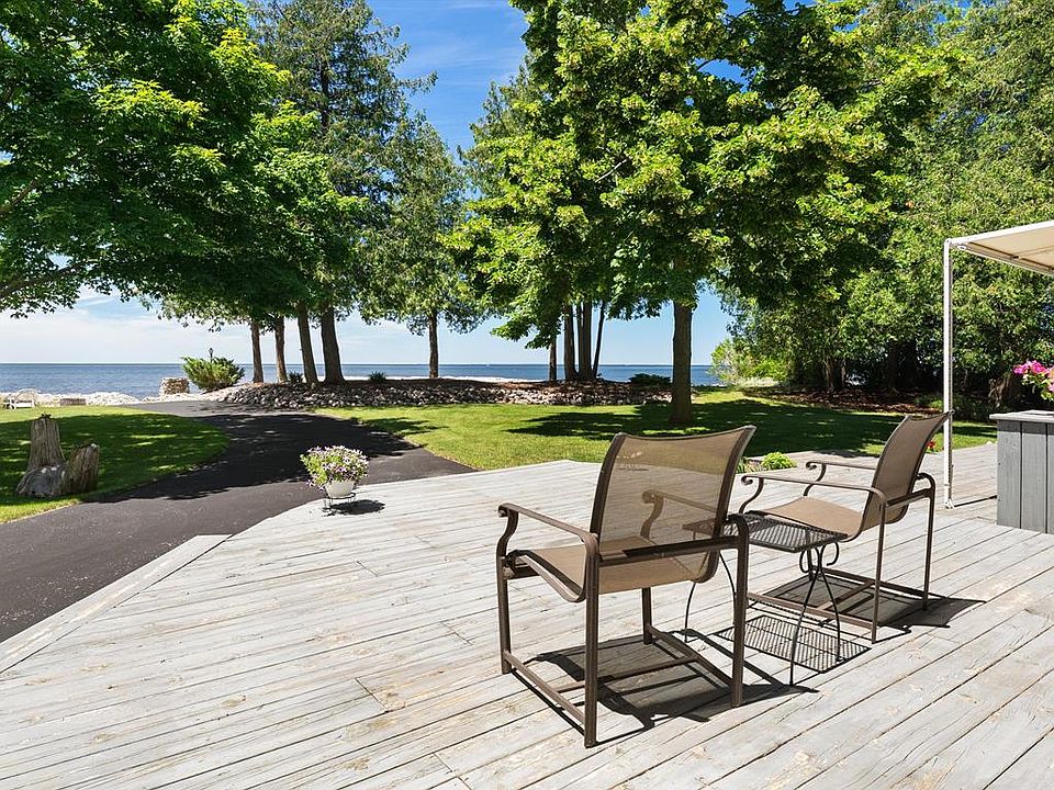 It doesn't get better than this! This 3 bedroom, 2 bath home has a park-like setting with 179' of Green Bay's beautiful shoreline to enjoy. A late day fire and sunset from the water's edge patio is the perfect way to end the day. The home takes great advantage of the view at every turn. It offers a beautiful beach stone fireplace in the original part of the home and a large living room addition complete with a wall of windows to enjoy the view of the bay. The primary bedroom overlooks the water with an airing porch for private retreat, both bathrooms have been upgraded with new fixtures, an expansive awning-covered deck, lawn for games and a gazebo are set for you to enjoy the quiet life off the beaten path. (*one stall garage door)