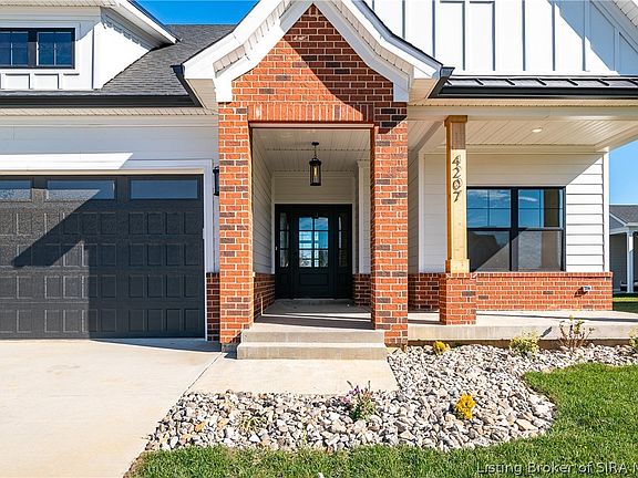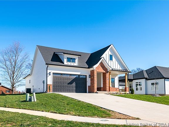 CRAFTSMAN STYLE BRICK & HARDIE 3BR/2B HOME LOCATED NEAR I65/I265, DINING, CHURCHES, SCHOOLS, & ENTERTAINMENT! Trim detail includes coffered 10' ceilings in FR, tray ceilings in BRs 1 & 3 along with the DR and BR2 has a vault. Kitchen is complete with an island & bar overhang, large walk in pantry, custom tile backsplash, stainless appliances include a wall oven, gas cooktop, microwave, dishwasher, & disposal. Flooring is rev wood in the main living areas, tile baths/LR & carpeted BRs & closets. Exterior front is landscaped w/a covered porch/patio, concrete walkway/porch/driveway, public sidewalks throughout community, & street lights. MUCH MORE! AGENT IS RELATED TO SELLER!