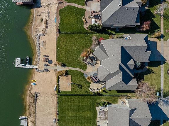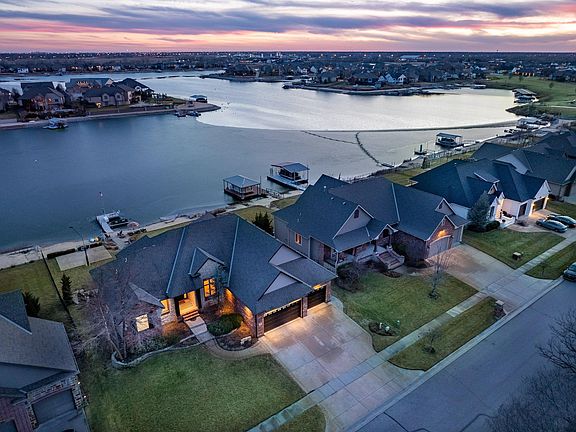 Imagine the perfect lakeside oasis for entertaining friends and family, complete with endless outdoor fun and gorgeous views from every angle. Located in one of Wichita's premiere lake communities, Emerald Bay Estates, this lake accommodates surfing, wakeboarding, water-skiing, jet skiing, and pontoon boating, along with all the other non-motorized lake activities. This picturesque home is conveniently located close to top schools, shopping and dining, plus enjoy a sandy beach, and private dock right out your own back door. This spectacular home will leave you speechless - it's the best of elevated finishes combined with indoor/outdoor living. Enjoy the sunset from the covered deck or the many expansive windows throughout. You'll love making memories right in your backyard, as each season brings something new. Friends and family can spread out in this spacious 6-bedroom home - it boasts so many entertaining options as well! Each living space and convenient outdoor space provides places for intimate gatherings, as well as options for large outdoor groups to gather. No detail has been overlooked here, from the covered deck, outdoor stone firepit, sport court, fresh interior and exterior paint, and white-washed stone fireplaces, to the new basement flooring. The walk-out basement also features a recently redesigned modern bar with new quartz countertops, perfect for serving drinks and snacks as friends and family return from a day on the water. You'll love the master suite with breathtaking water views, a spacious ensuite bath with double sinks, and roomy walk-in closet with ample storage. Entertaining is a breeze with an open kitchen adjacent to a stunning hearth room, which features vaulted ceilings and easy outdoor access. Neighborhood amenities also include area pool, playground, sand volleyball, and pickleball. Plus a spacious community clubhouse is available to rent for personal use. Premium living is here! (AND NO SPECIAL TAXES!! ...Saving you thousands of dollars)
