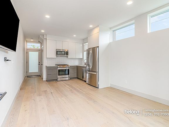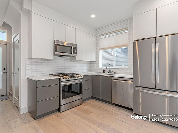 Tucked into one of Fremont's quieter corners, this modern 2-bedroom, 2-bath home pairs clean design with standout comfort - and it includes a private rooftop retreat with sweeping views of the city and mountains beyond. Whether you're starting your day with a cup of coffee beneath the morning sky or winding down as the sun sets, that rooftop space offers a tranquil extension of your living area. Inside, the main living space is bright and efficient, featuring light-toned floors, a wall-mounted mini split for year-round climate control, and a layout that easily accommodates both relaxing and entertaining. The kitchen brings crisp contrast with flat-panel cabinetry, sleek counters, a subway tile backsplash, and a full set of stainless steel appliances, including a gas range and built-in microwave. Both bedrooms are carpeted for comfort and enjoy ample natural light, and both include a built-in closet to help you stay organized. Each bathroom supports daily routines with streamlined fixtures and contemporary finishes. Plus, with thoughtful window placements throughout, you'll enjoy privacy without sacrificing daylight. Beyond the home itself, you'll love being part of the Fremont neighborhood a walkable hub for artisan coffee, excellent local dining, and laid-back charm. Grocery stores, parks, and the Burke-Gilman Trail are all within easy reach. *Our homes come as-is with all essentials in working order. Want upgrades? Request it through the Belong app, and our trusted pros will take care of the rest!