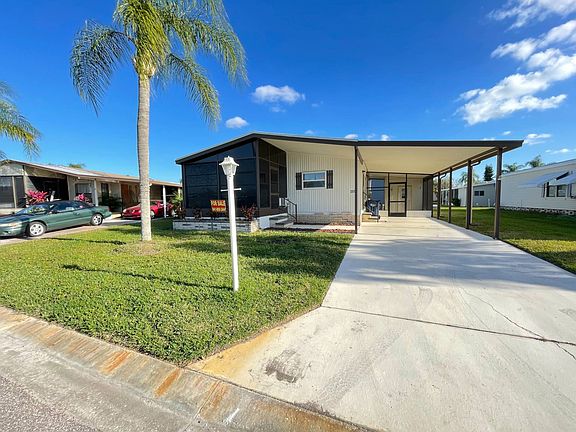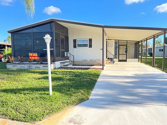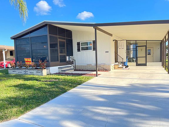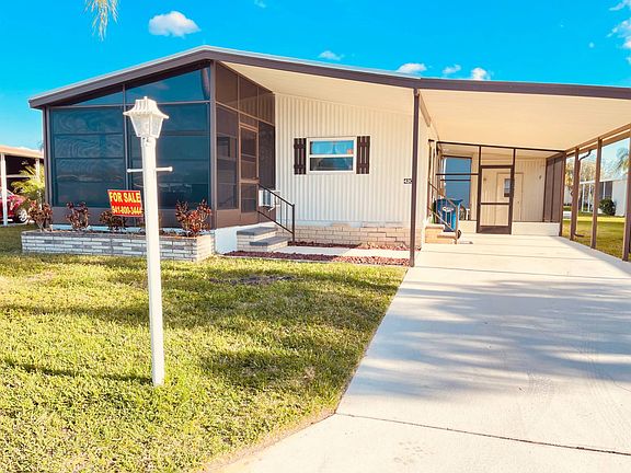 This home is in an age-restricted community that is Pet friendly; you must be 55 or older. The home is a 1985 two-bedroom 2 bath turnkey home. In the home, you'll find vaulted ceilings, a new AC unit, and ducts installed in 2019, The vapor barrier was placed in 2020 Along with a new sump pump and tie-downs. All the windows are thermal pain that opens inwards for easy cleaning. The kitchen and hallway have new flooring. In the Living room, you'll find new carpeting. In the front of the house is a lanai with its own AC for the hot months. In the cooler months, you can open the windows and enjoy the Florida breezes. At the end of the long driveway, there is a 2nd screened lanai that had all screens replaced. There is a shed that houses the washer and dryer and room for storage. This house is ready to go don't miss out. The lot rent on this home is estimated to be $947. per month. It covers everything except electricity, cable tv/internet. Your water, sewer, and trash pickup twice a week, recycling, all property taxes, and lawn maintenance are included along with all these amenities. The park is pet-friendly with a fenced pet park. Offering 5 clubhouses, 6 heated pools, a riverfront pavilion with a fishing pier, marina, pool tables, libraries, bingo, dances, Cruise ship style shows, tennis courts, shuffleboard, new pickleball courts, horseshoe pits, woodworking shop, 2 fitness centers, over 75+ different clubs, 24-hour patrol and free community bus that goes to shopping malls and food stores plus many other locations. The Cove offers so much more. If you get bored here, it's your fault. All listing information is deemed reliable but not guaranteed and should be independently verified through personal inspection by appropriate professionals. Integrity Mobile Home Sales cannot guarantee or warrant the accuracy of this information, measurements or condition of any property. Measurements are approximate. Lot rent is subject to change.