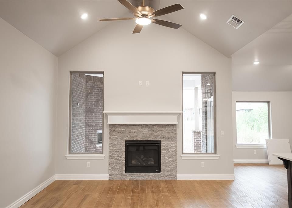 This Hummingbird floor plan features 2,025 Sqft of total living space, which includes 1,800 Sqft of indoor space and 225 Sqft of outdoor living. There is a 565 Sqft, three car garage with an in-ground storm shelter installed. This home offers 4 bedrooms, 2 bathrooms, 2 covered patios, and a large utility room. The great room welcomes a breathtaking cathedral ceiling, a gas fireplace with our stacked stone surround detailing, large windows, rocker switches throughout, wood-look tile, and Cat6 wiring. The high-end kitchen has 3 CM countertops, custom-built cabinets to the ceiling with cabinet hardware installed throughout and under cabinet lighting, stainless steel appliances, a 5-burner cooktop, vogue tile backsplash, stellar pendant lighting, a corner walk-in pantry, and a large center island equipped with a trash can pullout, work station sink, and dishwasher. The elegant primary suite has a sloped ceiling detail with a ceiling fan, windows, Cat6 wiring, and our cozy carpet finish. The attached spa-like bath includes a dual sink vanity with framed mirrors, TWO spacious walk-in closets, a roomy European walk-in shower, and a free-standing tub. Secondary bedrooms feature high ceilings with ceiling fans, windows, spacious closets, and carpeted flooring. The covered back patio offers a wood burning fireplace, a TV hookup, and a gas line for your grill. Other amenities include Healthy Home Technology, a fresh air ventilation system, a tankless water heater, R-44 insulation, and more!