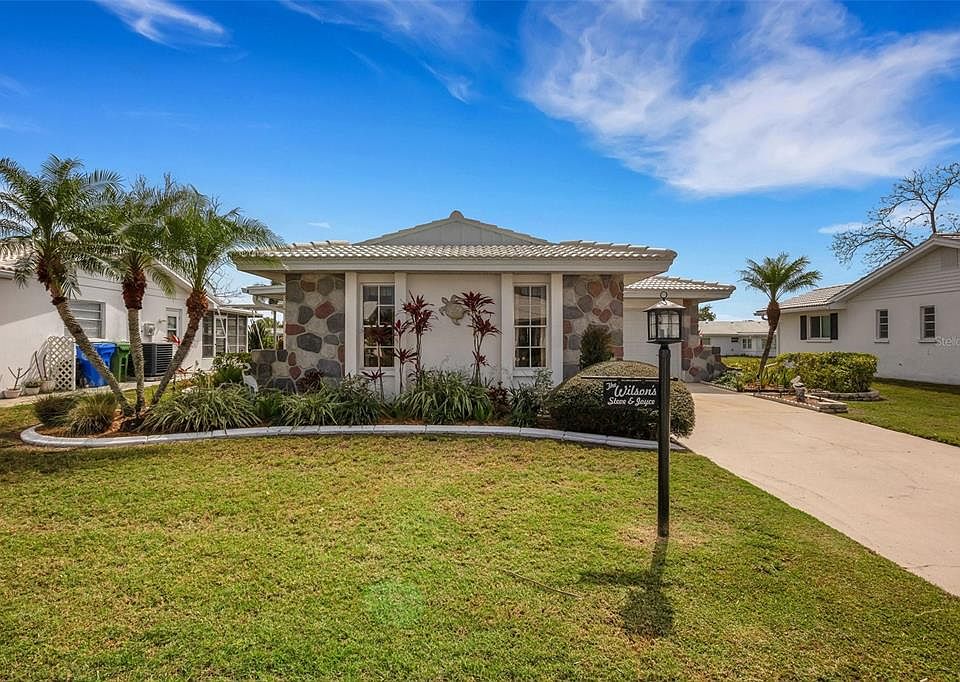 Charming and Affordable in the premier 55+ golf community of River Isles. Wonderful curb appeal with a mix of landscaping that adds to the exterior charm. Setting in a quiet cul-de-sac at the edge of a relaxing pond view, this 900+s.f., 1 bedroom, 1 bath, may be the ideal 'snowbird' home or an ideal home for down sizing. You enter into the home from the driveway entrance, or from the one car garage. The efficient galley kitchen is right in front of you, handy when unloading the car with packages or grocery items. There is a dinette straight ahead with a slider opening to a covered patio. Leaving for a vacation or to go back home, just lower the bimini shutter and your slider is protected. The laundry is adjacent to the dinette. To the front of the house is the light and bright living room. The furniture placement is such that the entertainment center is the focal point so all have a comfortable view of the TV. Moving to the rear of the house, to the left just past the kitchen is the bathroom, with combination tub/shower. Continuing to the rear, your next stop is the sizeable bedroom, with an oversized walk-in closet. To the rear of the house is the lanai with access to the patio to do some grillin' and chillin'...and a view of a pond and all the birds that aim to please you. Great location for that morning sunrise coffee, or a wonderful sunset and your favorite libation. The house is certainly comfortable in all regards. The community is located minutes from shopping, dining, medical, worship, interstates, airports, the manyu area cultural amenities and the beautiful water and beaches of the Gulf of Mexico. The clubhouse is the focal point of a host of activities ranging from luncheons, dinners, dances, entertainment, meeting rooms, game rooms, exercise room, secure mail room, BINGO!, professionally maintained shuffle courts(of which is a very active attraction that is a hoot to play), temperature controlled pool for your year around enjoyment(water aerobics to keep you fit). There is also a community owned, professionally maintained, executive golf course that is anything but a par 3. Bring your driver! Whether you want to be involved or just lay back to enjoy some quiet time, the community has it all. This house can be your home! Disclosure: there is a one time $2000 capital contribution fee paid at the time of closing by the new owner(s). Don't let the opportunity to own an affordable home pass you by. Property offered with furniture per inventory. NOTE: Old Republic Home Warranty Included.
