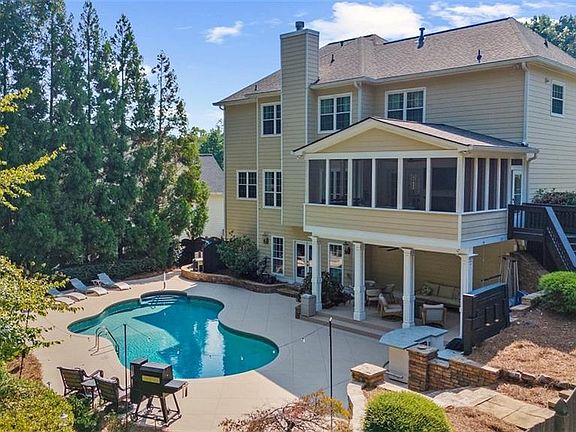This beautifully maintained home blends timeless design with modern updates, creating the perfect retreat. Step inside to a jaw-dropping two-story foyer and immediately feel the warmth of this inviting space. Highlights include updated windows, newer carpet, a recently repainted exterior with Hardie Plank siding and brick front, and an epoxy-finished oversized garage. A private office with custom built-ins and a new aluminum-clad door offers the perfect work-from-home space, while the large dining room flows easily into the open-concept kitchen and living room. The oversized kitchen features wood-stained cabinetry, stainless steel appliances, a stunning backsplash, and a sink window framing incredible outdoor views. Step directly onto the expansive screened-in porch, which overlooks the private backyard oasis. The fireside living room with coffered ceilings is perfect for gatherings, and hardwood floors run throughout the main level and upstairs hallways. The owner's suite is oversized with space for a sitting area and a fully renovated marble bathroom with soaking tub, double vanities, and a large walk-in closet. Upstairs, you'll find three more spacious bedrooms, a full bath, and a walk-in laundry room. The finished basement is a true showstopper, complete with a wet bar, full bath, oversized bedroom, custom built-ins, theater room, and game room. Outside, enjoy resort-style living with a large saltwater pool, expansive pool deck, covered patio, and private fire pit area. The landscaped backyard extends beyond the fence to the serene creek, offering unmatched privacy and natural beauty. With a 30-year architectural roof (only 5 years old) and a location minutes from Kennesaw Mountain, Marietta Square, Downtown Acworth, shopping, dining, I-75, and more, this home offers the best of convenience and tranquility. Don't miss the chance to own this one-of-a-kind property!