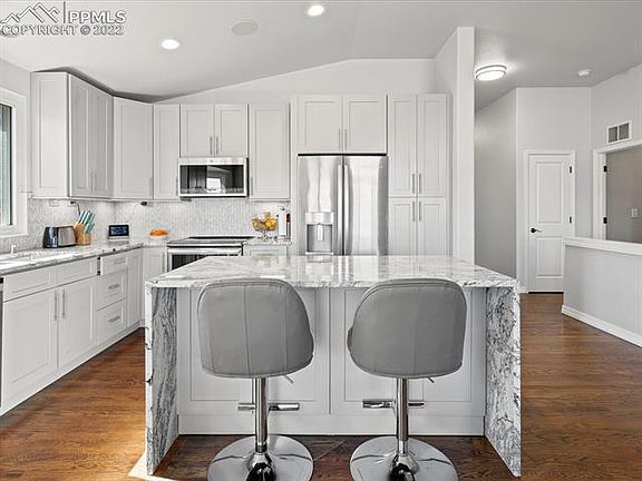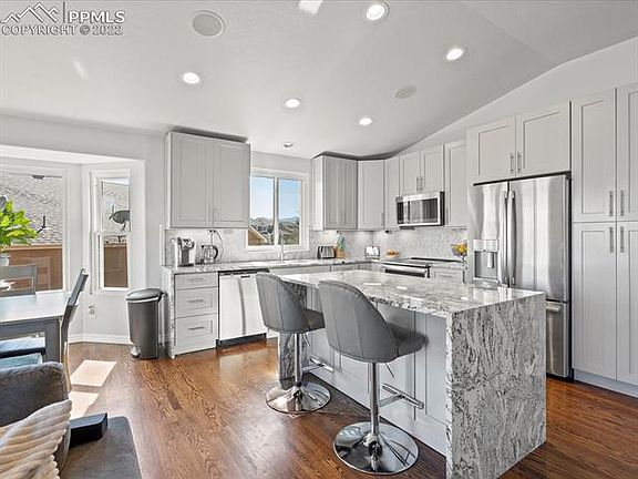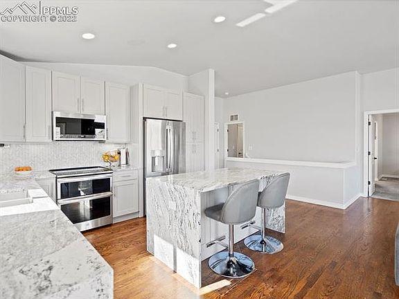 Absolutely gorgeous ranch-style home with a kitchen you'll fall in love with, directly across from a park and Springs Ranch elementary school! This home has been well maintained and well updated. Walk through the entry and experience a stunning remodeled kitchen with granite countertops that waterfall to the floor on three sides. Brand new soft-close cabinetry throughout home with new appliances and double oven. Amazing open floor plan that flows into a dining room and living room, with vaulted ceilings and lots of natural light. This home is perfect for entertaining with hardwood floors throughout your main floor, a living room that features a gas fireplace, and dining area with a bay window and access right to your deck. Enjoy views of the mountains from the deck, mature trees in your backyard, nice landscaping, and a peaceful neighborhood. You will enjoy fireworks every Friday night from the driveway of your three car garage - launched from the baseball field nearby. The main-floor master bedroom is spacious with good natural light, and a master bathroom with heated floors! The basement features two huge rooms with walk-in closets, full bathroom, and a 6th bedroom (non-conforming) that can be used as a theater room. The home has speakers already built into the ceiling, and a large family room in the basement. Roof is class-4, 3 years old with a full transferable warranty. Furnace recently cleaned and inspected. New windows and new carpet throughout entire home. Smoke detectors are all new and hardwired. Washer and gas-dryer stay with the home. This home is an absolute must-see and move-in ready!