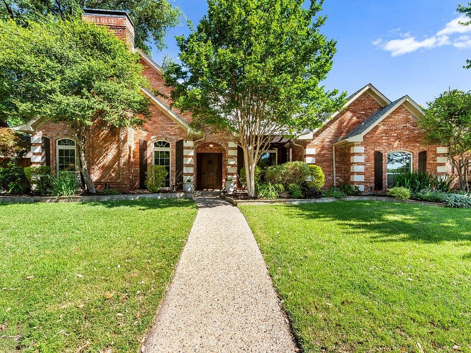 Nestled in coveted COUNTRY BROOK this captivating home has rare, exceptional views of the park & natural pond outside your front door! Inside, the living room is illuminated by picture windows & multiple skylights with views of the spacious covered porch. The dining room features a big picture window with idyllic views of the pond, park & nature. Soaring beamed ceilings; floor to ceiling brick fireplace; hardwood floors & built-in cabinets warm the spacious front living area. A welcoming eat-in kitchen with center island & abundant cabinet space is open to the center living space & fireplace. Split primary bedroom with updated ensuite & custom closet. Three secondary bedrooms, 2 share a jack & jill bathroom & one was used as an office. Serene barely describes the covered outdoor space with built-in cooking area & pool complete with mature landscaping. Beautiful maintenance-free perennial landscaping in front & back yard. Highly rated Plano ISD; premier location with a peaceful escape.