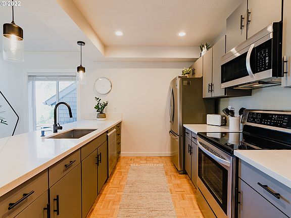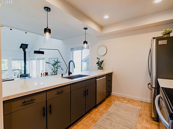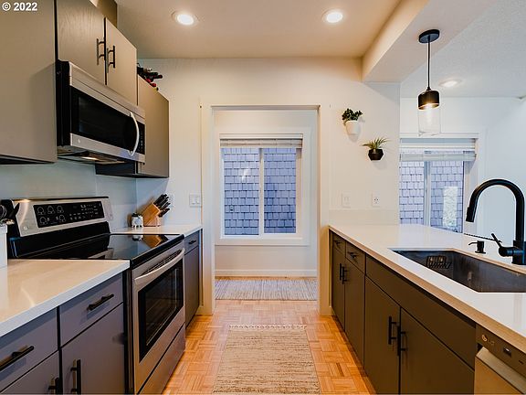Beautiful contemporary home on a quiet street in SW Portland w/ an awesome view from your back deck. This house is turn key ready w/ so many upgrades including quartz countertops, interior and exterior paint, new LVT flooring, new heat pump, windows, deck, carpet, the works! Home includes 2 bedrooms & 2 bathrooms w/ direct access to a roof top deck above a brand new garage. Enjoy an open concept with plenty of natural light and easy indoor/outdoor entertaining areas & a very convenient location. [Home Energy Score = 1. HES Report at https://rpt.greenbuildingregistry.com/hes/OR10131801]