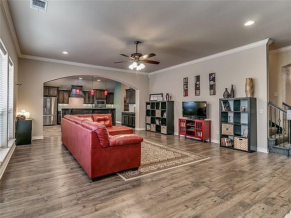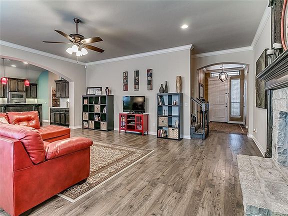 This exceptional custom built entertainers dream home is located in Carrington Place! From the moment you walk in, you will love all the upgrades and endless closet space!! The large open concept great room/kitchen boasts a beautiful fireplace, on site built cabinetry, gorgeous wood floors, slate tile and 10' high ceilings. The chef's kitchen features stunning woodwork, quartz counter tops, S/S appliances, center island w/ breakfast bar, huge pantry and service area. In the master suite you will find luxury at it's finest with separate vanities, oversized tile shower, jetted tub and a huge walk-in closet! The upper level features a bed/game/bonus room with 1/2 bath. Large bedrooms with vaulted ceilings and huge closets! Office/study/play room has french doors and vaulted ceilings. Oversized 3 car garage with an in ground storm shelter. The neighborhood amenities include 2 clubhouses, 2 swimming pools, playgrounds, jogging track, basketball court, soccer fields, common areas and ponds!