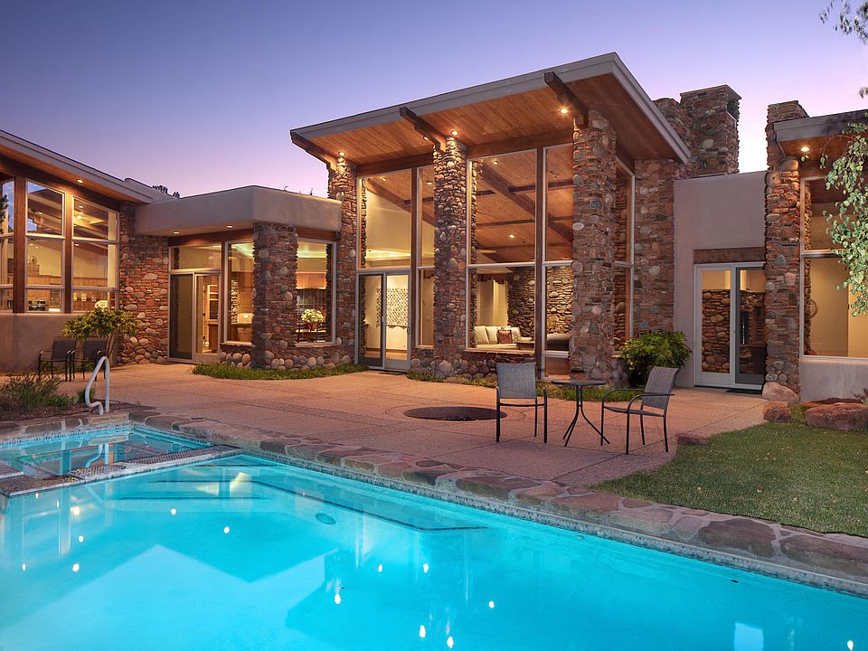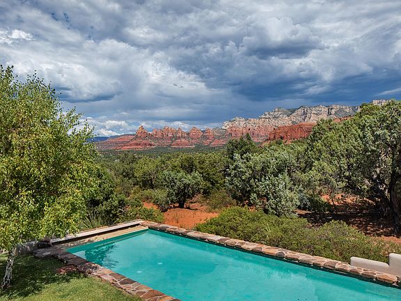 Perched atop the neighborhood with commanding hilltop views, this single level custom home backs to Coconino National Forest for privacy and seclusion. Vaulted ceilings and floor to ceiling windows frame massive red rock views from the living room, inviting you outside to the perfect entertaining backyard with pool and nature preserve overlook. Organic touches throughout the home include locally sourced stacked red rock and river rock and natural plank hardwood flooring throughout. Ideal for entertaining this home features a farmhouse feel with large kitchen and dining room space with quartz and stainless countertops, 8' wide Sub Zero refrigerator and plenty of space for kitchen gatherings. Double office space and enormous master suite complete with gym and laundry make this a Sedona gem!