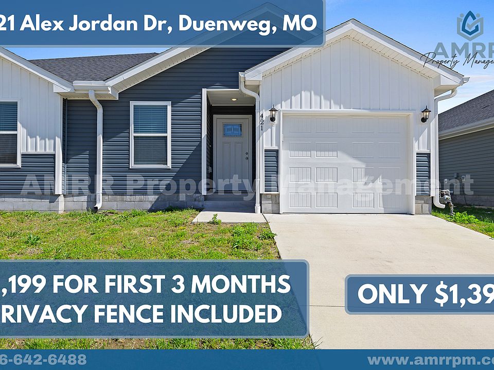 SPECIAL: $1399 Reduced Rate with a signed 12 month lease and/or $1399 Reduced Rate with $200 off for the first 3 months with an 18 month signed lease! Owner is also installing a new backyard privacy fence! Welcome to your new home with AMRR Property Management, featuring 1,445 square feet of living space, 3 bedrooms, 2 baths, and a 1 car garage. This new construction home is located in a new development on Alex Jordan Drive in Duenweg, Missouri, located in the Joplin school district, and it has everything you need in a rental. The kitchen features a stove, microwave, dishwasher, custom cabinets, a stainless steel fridge, and vinyl flooring that extends throughout the home, which means NO carpet whatsoever. The backyard includes a relaxing covered patio and a spacious grass backyard. Length of lease can be between 12 and 24 months. Utilities are ALWAYS the responsibility of the tenant, unless otherwise advertised. Tenants are responsible for all lawn care and maintenance during tenancy, unless otherwise advertised. Security deposits are required for most properties, but we offer various deposit amounts and payment options, which are determined during the application process. Application fees are generally $45 but few can waive the application fee if an application is filled out within 24 hours after you complete a scheduled showing with one of our leasing agents. Normally, only 2 pets are allowed per property and we charge a one-time pet fee of $250 per pet, with no breed restrictions or weight limits, unless otherwise advertised. No smoking of any kind is allowed inside the property or garage.