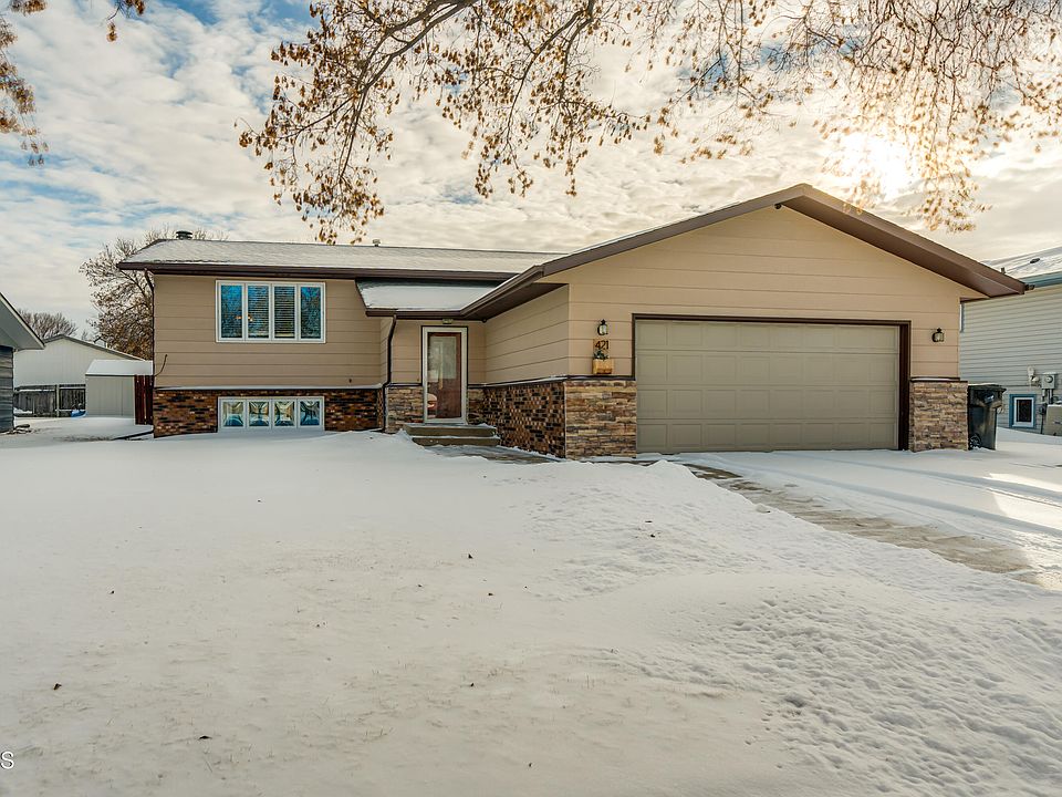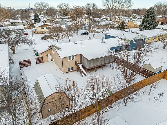 Don't miss this charming split entry home located in an established, sought-after neighborhood in Southwest Bismarck. This home has tons of updates from laminate flooring throughout main level, updated kitchen cabinets, new dishwasher, updated living room and family room windows, freshly painted and additional recessed lighting in living room. The main floor offers a semi-open floor plan, bright living room, and updated kitchen with new Quartz countertops and center island with tile countertop. There is informal dining with sliding doors out to the fully screened in deck (newer screen recently installed). Plus there are two bedrooms on the main level including the Hollywood style primary bedroom that has walk though door to the main bathroom. The updated main bathroom includes a whirlpool tub with tile surround. The lower level offers a daylight family room with new carpet and a wood burning fireplace, two additional bedrooms, 3/4 bathroom and the laundry area (washer and dryer are included). The exterior with recent fresh coat of paint features updated stone accent around garage and an additional concrete parking pad. The yard has a sprinkler system and the backyard is fully fenced and boasts a large shed that has electricity and an exhaust port for a propane heater, if desired, plus newly installed lawn edging and river rock around house and shed. Located in a quiet, established neighborhood with easy access to schools, parks, and shopping, this home has everything you need and more. Call a Realtor today to see this wonderful home!