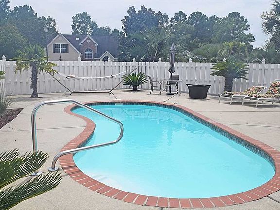 This lovely 3 bedroom/2 bath home with inground pool is situated on a .25 acre lot on a cul-de-sac street in popular Brandy Mill subdivision, an established community with lots of trees, mature landscaping, spacious lots and a very low HOA fee. The master bedroom and bath are located on the first floor, with two additional bedrooms, bath and small sitting area on the second floor. The kitchen features granite counters, stainless appliances, and tile floor. Hardwood flooring flows from the foyer into the great room which features a vaulted ceiling, gas fireplace and built-in bar area with wine cooler. A small office area off the great room leads out to the sparkling pool with many tropical landscaping and an Italian water fountain. New roof in 2015 and newer HVAC system. Award winning school district with high school and new elementary school close by. This convenient location offers easy access to Bypass 17 and is just minutes away from the Market Common, Myrtle Beach State Park, shopping, dining, entertainment and the airport. Square footage is approximate and should be verified by the purchaser.