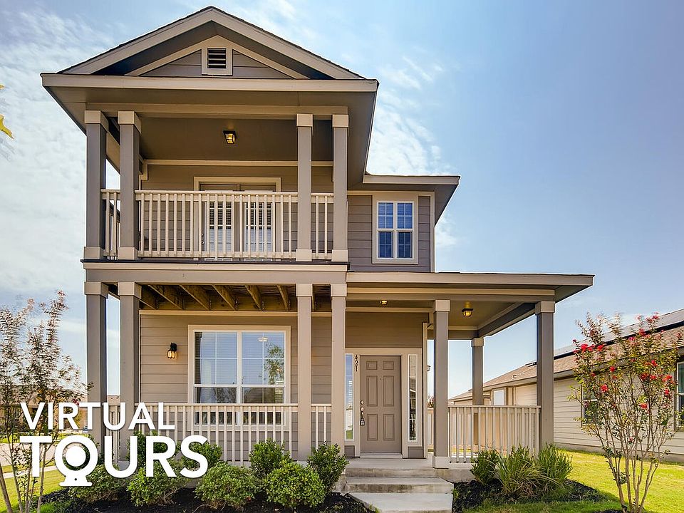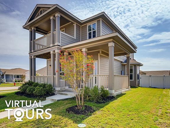 Adorable 3 bd / 2.5 ba corner lot home with an open floor plan, high ceilings, wrap around porch, and balcony! This recently built home is light-filled and inviting upon entrance with its large windows, warm walls, and neutral tile flooring. The living room sits to the left of the entrance with plenty of space to entertain. Flow into the kitchen, equipped with granite countertops, tile backsplash, stainless steel appliances, dark wood cabinets, and bar seating. Dine-in at the bar counter or in the chandelier lit dining room, which has access to the backyard through a glass door. A powder room completes this level. Head to the carpeted second floor to reach the primary suite, offering two closets, a wood vanity, and glass door tiled shower. There are two remaining bedrooms, one of which has French doors that lead to the front facing balcony. The hallway bath contains a wood vanity and shower/tub. Enjoy a fully fenced-in backyard with a lush lawn and access to the two car detached garage. Sprinkler system. Double paned windows. Central A/C and Forced Air heating. Located near the highly rated Highland Park Elementary School, trails, community pool/playgrounds, and Stone Hill Town Center shopping! Easy access to Hwy 45/130/I-35 and Austin. Buyer should verify all information.