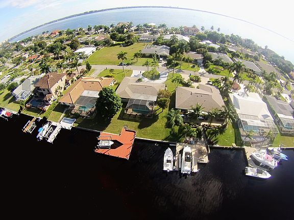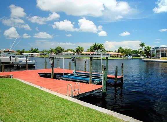 IT'S ALL ABOUT LOCATION! On a 200' wide direct access intersecting canal. Coral Dr is the best destination address of the CAPE CORAL YACHT CLUB! You'll love this charming POOL home on an expansive direct gulf access intersecting canal. Enjoy the stunning view from the spacious lanai. Relax in the caged in-ground pool that was installed in 2010. The layout is perfect, updated great room layout with living room, formal dining room or additional living area featuring a working fireplace. Large laundry room can be converted to den or 3rd bedroom. An open kitchen has stainless steel appliances and big breakfast bar. Living areas are tiled. The fireplace, generous closets/storage, oversized master bedroom, vanishing sliding doors to lanai, circular drive, 10,000 lb. boat lift, captains walk, and extra large indoor laundry room make this home fabulous. Seller may hold $100,000 note. FURNITURE INCLUDED! MOVE RIGHT IN! THIS HOME IS IMMACULATE AND WELL MAINTAINED!