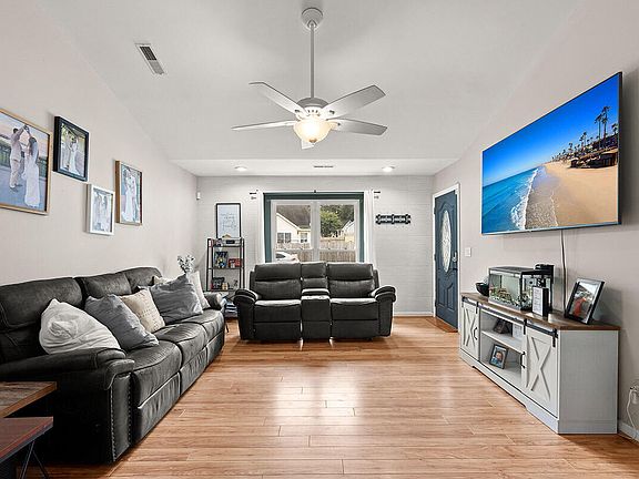 This charming ranch home is tucked away in a quiet neighborhood, with no HOA. As you enter, you're greeted by laminate wood floors throughout, vaulted ceilings, and a bright floor plan with plenty of natural light and a great flow for entertaining and everyday living. The updated eat-in kitchen boasts granite countertops, a stylish subway tile backsplash, white cabinetry, and a dining area overlooking the backyard. The spacious master bedroom features a private en suite bathroom with ceramic tile flooring and a large walk-in shower. The patio and fully-fenced backyard will be perfect for grilling out, entertaining, or watching the kids and/or pets play. Conveniently located near shopping, dining, schools, and Nexton. Come see your new home, today!