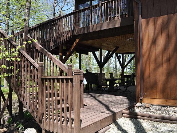 Nature Lovers Paradise ! Almost 7 acres surrounding this lovely & unique home. The upper level is the "main living" area that is a log type of design with many beautiful windows also includes the master bedroom/bath,large family room,kitchen and dining area. Main living area (upper) also has a vaulted ceiling a beautiful wood burning fireplace and sunroom. You also will spend a lot of time on the upper deck. The main level is the garage, the second bedroom, bath and laundry area.From the bedroom is a patio door to the 2nd deck. Shed /workshop is 14x20.Metal roof replaced 2016 and central air new in 2019 The entryway to the home is through the garage---