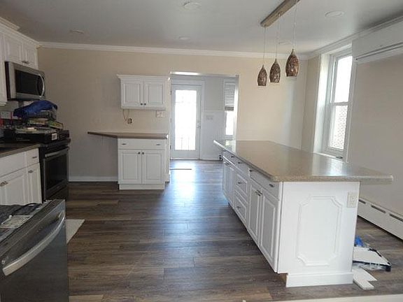 Beautiful 3 Story home with fenced yard. Mini split air conditioning. Totally rennovated with kitchen island/breakfast counter. Main floor laundry. Brand new stainless appliances (range, dishwasher, refrigerator, washer and dryer. ) Living room, Kitchen, Laundry Room on first floor. 2 Bedrooms, walk in hall closet and full bath on 2nd floor, 3rd bedroom on 3rd floor. Unfinished basement with a full finished bathroom. Covered front porch, rear patio. Garage is NOT part of rental. Tenant pays all utilities: water, sewer, trash, oil hot water cast iron baseboard heat (new high efficient heater just installed), electric, cable, internet, phone, lawn care and snow removal. Will consider 1 small pet. All interested parties must complete a full application for pre-qualification prior to viewing being scheduled.