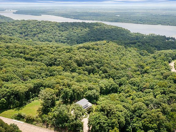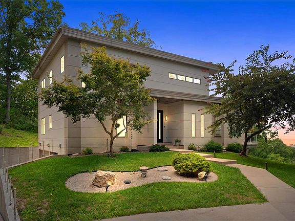 Must see in person- 1st time on market, stunning 3,524 sf Frank Lloyd Wright inspired custom home is privately perched atop the bluffs with breathtaking bird’s eye view of the river & beyond. Walk into flowing living space on top engineered hardwood floors with gas FP, European designed cabinetry & woodwork, open kitchen with island & bar sink, designated dining area with view. It’s the perfect place to entertain. Feels like a retreat on the 440 sf composite deck with impressive views & tree surround. Three generous bedrooms are all ensuite with the primary offering dry sauna & balcony. This quality built home has many high-end offerings & amenities: space for an elevator, 50 yr rubber roof, Marvin windows, tankless water heater, water softener, 2nd FL laundry, plentiful storage space, heated sidewalk , 3car-garage. Minutes from the Midwest ‘Key West’ with a zipline park, restaurants, Skylift, waterpark, wineries, wooden rollercoaster, state park, golf course & marina. -Home warranty-