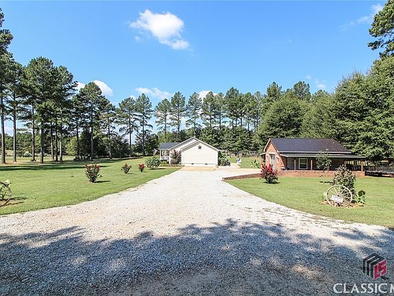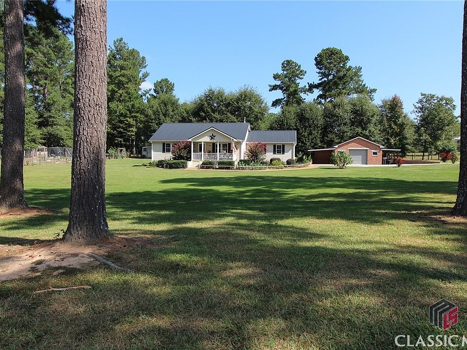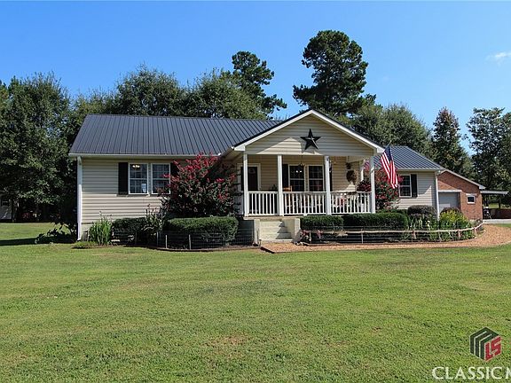 Amazing home, detached garage/workshop and 2 acre square lot. Garage/workshop has roll up door, storage room, brick and block construction, power, lights, window unit a/c, metal roof and roof extensions with concrete pads on both sides. Great outdoor space with patio, fire pit, garden areas, nice landscaping, lush lawn that is spacious at the rear with privacy fence and sides of lot and huge in the front for family games, sports and activities. Lots of parking. Home is in excellent condition. Metal roof, covered rear porch and large covered front porch. Updated interior has new distressed painted cabinets in large kitchen with large breakfast area, granite look counter tops, new luxury vinyl tile, stainless dishwasher, microwave and range. Kitchen and breakfast open to large family room with grooved engineered hardwood flooring. Large pantry/storage area off of kitchen. Hardwood floors in bedrooms, baths, halls and laundry room. This large laundry/storage room has space for washer, dryer, storage and 2 additional refrigerators or freezers. Updated vanities in both baths. Large master walk in closet. One strand of outdoor lights remain with property.