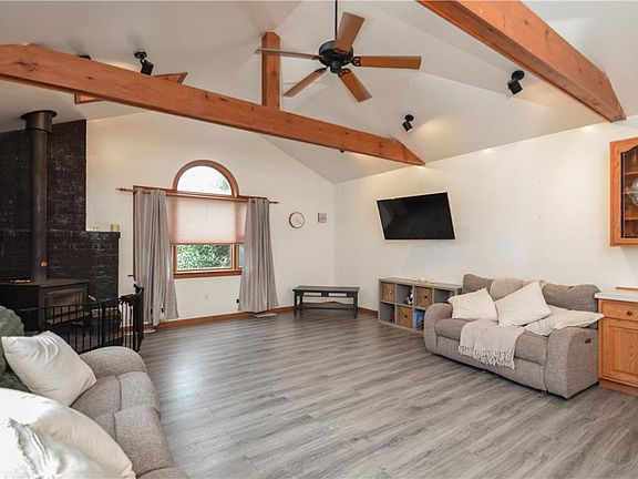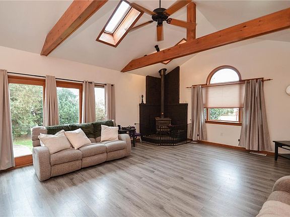 - Description: Vaulted ceiling with fan, sky light, wood beams, wood stove, French door, dry bar, laminate flooring