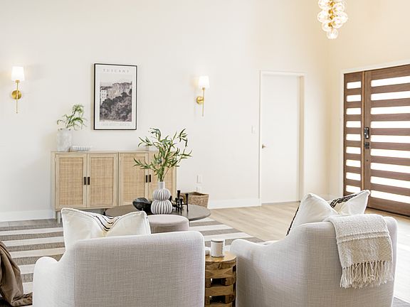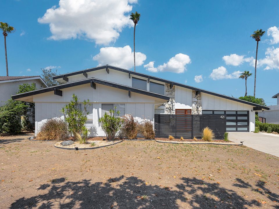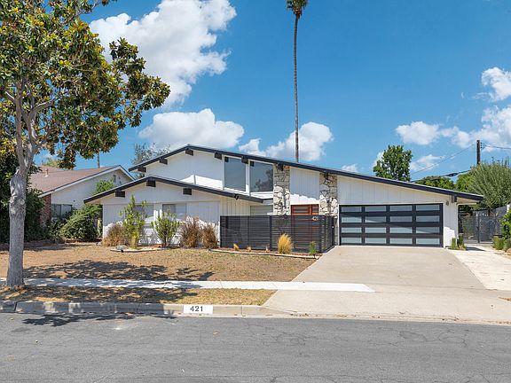 Welcome to 421 Larry Lane, a charming mid-century modern home nestled in the highly sought-after city of Placentia! This beautifully updated 3 bedroom, 2 bath residence features high vaulted ceilings and oversized windows that fill the home with natural light, creating a spacious, clean, and functional living space. The expansive living room flows effortlessly into the updated kitchen and dining area, perfect for everyday living and entertaining. The kitchen is sleek and modern, showcasing a subway tile backsplash, quartz countertops, new stainless steel appliances, and a generous eat-in island with ample space for cooking and gathering. The cozy dining room features a warm fireplace and newer sliding glass doors that open to a large backyard oasis complete with a built-in BBQ and a stylish new pergola, ideal for outdoor entertaining. Downstairs, the two spacious bedrooms offer custom built-in closet shelving and easy access to the tastefully remodeled hall bathroom, conveniently located near the kitchen and dining areas. Upstairs, the private primary suite provides a peaceful retreat with its own updated en-suite bathroom, designed with simplicity and modern elegance. Additional upgrades include new SPC plank flooring throughout the downstairs, fresh interior and exterior paint, a sleek gated front patio, and added concrete in both the front driveway and backyard for extra functionality. The attached 2-car garage is equipped with A/C and built-in storage, making it perfect for a home office or gym setup. Included in the sale are a new washer/dryer, refrigerator, and a smart Nest Yale lock for convenient keyless entry. Located near top-rated Placentia-Yorba Linda Unified schools, parks, shopping, and dining, this well-maintained home offers the perfect blend of comfort, style, and convenience Tenant pays all utilities.