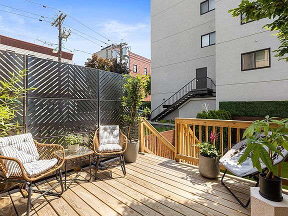 Welcome to this immaculate and expansive two-bedroom two-bathroom home with a approximately 1,000 sq ft. PRIVATE backyard oasis in the center of Hoboken. This parlor level apartment (NOT ground floor) is flooded with natural light, offers high ceilings, an open floorplan, and has been meticulously renovated from top to bottom in 2022. The end-to-end full gut renovation included brand new wide plank oak flooring, new mechanicals, brand new bathrooms, kitchen, and a complete overhaul of the private backyard. The owners spared no expense in this high-end luxurious renovation. This home is fully smart enabled including app and voice controlled smart light switches, all smart appliances including a massive Samsung washer dryer, Nest thermostat, and Nest Smoke Alarms. The Central A/C and heating are brand new and recently installed in 2022. The open chef’s kitchen with a Calacatta Quartz island flows seamlessly into the living and dining space, making it perfect for entertaining. This sleek and modern kitchen features a waterfall countertop, smart appliances, custom cabinets designed to maximize storage, a seated bar area fit for 3-4 stools, two-zone wine fridge, Moen touchless kitchen faucet (with app or voice activation), and garbage disposal. Smart Kitchen appliances include: Samsung 5 burner range + oven with airfryer setting, powerful modern stainless steel vent, over-sized Samsung refrigerator with water dispenser, and Zline dishwasher with custom wood panel. The generous king-sized primary bedroom offers a beautiful bay window with a serene view of the backyard and has large custom closets. The secondary bedroom also has a large bay window, custom closets, and can accommodate a king-sized bed. Both thoughtfully designed spacious full bathrooms boast rainfall showers, smart lighting and fans, bluetooth built-in speakers, and mood lighting. The private backyard is professionally landscaped with almost 1,000 sq ft of additional living space! Custom features include: blue stone pavers, a newly constructed deck, horizontal cedar fence, raised garden bed, drainage system installed with 3 separate drains, and electrical installed throughout. Bluetooth outdoor lightning has been installed in the yard, within the deck, and in the raised garden. Beautiful Arborvitae trees in raised garden provide additional privacy and the Irrigation system make watering the plants a breeze. 421 Madison is a well-maintained and pet friendly building. It offers residents the Butterfly virtual doorman system which provides the ability to grant access from your phone, provide digital keys, and ensure easy package drop off. The building is located within minutes of the new Hoboken resilience park, plenty of bars and restaurants, the bus to NYC, PATH, and light rail.