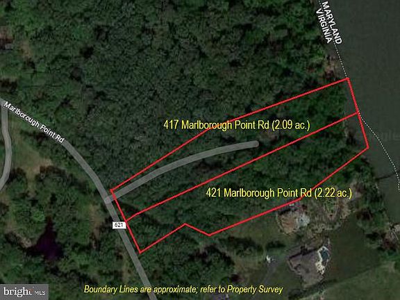 Rare opportunity to purchase 2+ acres of wooded, waterfront land directly on the Potomac River! Marlborough Point is a magical riverfront location in historic Stafford County that offers nearly everything you could ask for. Enjoying some of the best river views in Virginia, this luxurious community is a very private oasis of natural beauty with several $2M+ homes, served by a single roadway. Truly a retreat in every sense of the word. Two adjacent lots are available for individual sale; 417 Marlborough Point Rd (2.09 ac) and 421 Marlborough Point Rd (2.22 ac). Each lot has direct waterfront access with over 100’ frontage on the Potomac River, each has been approved for a 4-bedroom septic field, and each is further subdividable into two 1-acre lots, if desired. You could build two homes; a dream home overlooking the water for yourself, plus an income-producing property or home for extended family and relatives. Do you have a bigger vision and need more land? Purchase both lots and build a custom estate on 4.3 acres! Each property offers gorgeous sunrises from wooded elevations with a slope down to the water. You’ll be surrounded by pecan, elm, and other canopy trees while the shoreline awaits your future pier or private dock, with deep water suitable for sail or power boats. (There is an existing, paved driveway leading to a vacant home at 417 Marlborough Point Rd. The structure was damaged by a previous fire and is considered a tear-down; for safety reasons DO NOT ENTER.) Nature enthusiasts will love nearby Aquia Landing Park (a 32-acre public beach with fishing, swimming, and picnicking) and the Crow's Nest Natural Area Preserve (3,000+ acres of wetlands, forest, and streams, home to bald eagles). Stafford is ideally located between Northern Virginia and Washington DC to the north, and Fredericksburg to the south. You’ll benefit from the modern Stafford Hospital and commuters will appreciate the convenience of Route 95, Route 1, and the Brooke Station VRE. Stafford could be a perfect location for your weekend waterfront home or your full-time residence. From here you can visit area wineries/breweries, charter a local fishing boat, go antiquing, shark tooth and fossil hunting, explore historical sites, visit local farms to buy the freshest produce available… or simply relax and enjoy the amazing waterfront views!
