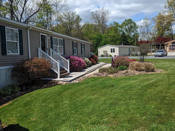 Welcome to this 2003 Redman Suncrest double-wide home! Featuring 4 bedrooms, 2.5 bathrooms, and a spacious kitchen with a center island for plenty of counter space. You'll notice how the owner meticulously cared for their home and its improvements. The sunken family room, outfitted with a gas fireplace and built-in bookcase/ entertainment shelving, is perfect for family gatherings. The primary bathroom includes a double vanity and a stand-up shower. The additional Fisher Structures shed measures 12x28. The attention to detail with the beautiful landscape will not disappoint. The lot around this home includes a wonderful front yard, and the wooded rear provides nice privacy. Lot rent is $260/month however will be increasing to $280 in January; it includes garbage, water, septic, snow removal from roads & Common area maintenance. Showings will begin on Friday and last through Sunday, with a winner announced Sunday evening or Monday. This timeframe is due to the seller's schedule.