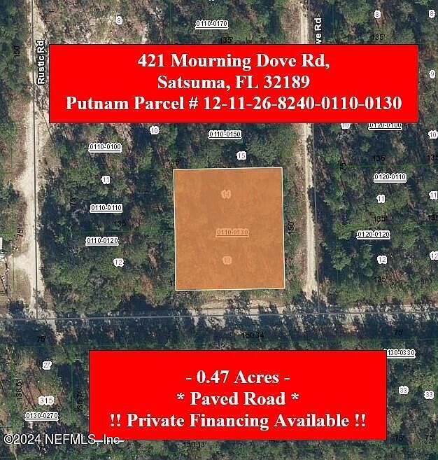 Discover the perfect canvas for your dream home on this serene 0.47-acre vacant lot in Satsuma. Nestled adjacent to Dunns Creek State Park, this property offers a tranquil escape from the hustle and bustle. Just a 5-minute drive from the St Johns River, you'll have endless outdoor activities at your doorstep—swimming, fishing, boating, and hiking. The lot is mobile/manufactured home-friendly, making it ideal for those seeking a quiet retreat or a full-time residence. With no HOA fees, low annual taxes, and proximity to beautiful river, this is your chance to invest in a nature lover's paradise! Only 35 minutes from St Augustine, this high and dry lot awaits your vision. Don't miss out on this good investment opportunity! Private Financing may be available with over 50% Cash Down. The address used to reference this lot has not yet been assigned; please use Putnam County Parcel 12-11-26-8240-0110-0130 to locate the property.