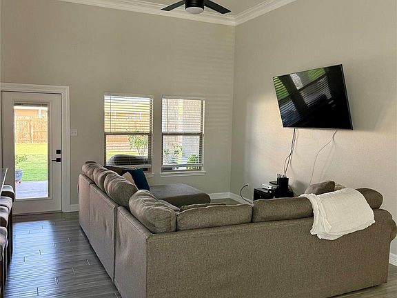 High ceilingsWindow blindsFull wooden privacy fenceCrown moldingLush landscaping