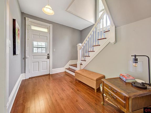 Lovingly cared for 1875 historic brick home: 3 bed/1.5 bath with 2 stall detached garage. Welcoming front porch wide and deep enough for an assortment of patio furniture. Entryway with open staircase leading upstairs on one side, opening to living room on other and access to the kitchen. Spacious living room with plenty of sunlight opens to large formal dining room. Kitchen provides a back entrance that leads to the detached garage in close proximity. Second floor houses three bedrooms and a full bathroom. Lower level has finished space (ceiling tiles recently removed for upgraded electrical install), half bathroom, utility room and plenty of space for storage. Conveniently located close to community events, parks and more. Updates include: high efficiency furnace installed (2022), large capacity A/C unit installed (2019), new shingles on house and garage (2011), water main to street replaced (2017), garage siding (2019).