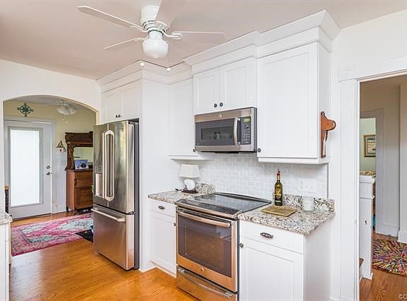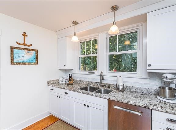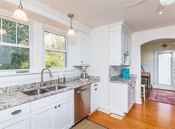 Renovated Cape Cod with 3 bedrooms and 2.5 baths located in the heart of Urbanna. This home has a new renovated kitchen with beautiful white cabinets, stainless appliances, and granite countertops. The master bedroom is huge and located on the first floor. There is plenty of closet space in the master bedroom and the master bath is completely renovated with standup tile shower. The family room has a gas fireplace and leads you out to your huge screened porch! The dining room is conveniently located just off of the kitchen. There are beautiful wood floors located on both the first and second floors. As you go upstairs you will find another renovated full bathroom with tile floors and shower! There are two more bedrooms located upstairs. This is a perfect house for entertaining inside or out. Outside you will find a rear deck area with stone patio, outside screen porch, 1 car detached garage and a beautiful yard with mature trees!