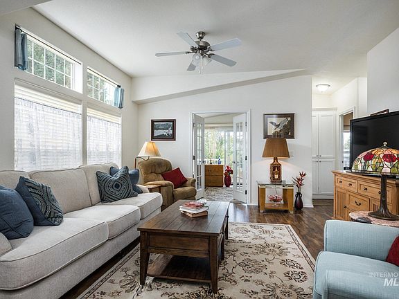 GORGEOUS and PRISTINE 55+ community single-level home with covered deck and raised water-view setting w/lush landscaping. Open floor plan, natural light, vaulted ceilings, skylights, wood laminate flooring and more! Garage has lots of built-in shelving, workbench and heater. Easy access to downtown, regional medical centers, Boise Towne Square and outdoor activities. Reasonable monthly land lease of $532. Don't miss out on this one!