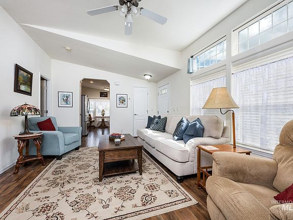 Seller will pay 1/2 of community fee for 3 years!!! At current rate- you'll pay just $347 a month. WOW! Beautiful and quiet, gated 55+ community, single-level home with covered deck and raised water-view (seasonal) setting with mature landscaping. Vaulted ceilings, open floorplan, generous space in kitchen, roomy primary bedroom, lots of natural light and gorgeous flooring in main living areas. Versatile den/office/crafting space with French doors opens to lovely covered deck area. Garage has lots of built-in shelving, workbench and heater. Quick and easy access to downtown, regional medical centers, Boise Towne Square Mall and outdoor activities. Freshly painted interior and new carpet. This is a lovely neighborhood with many activities planned each week for community members. Very low taxes! One of the best lots you'll find in Brookview.