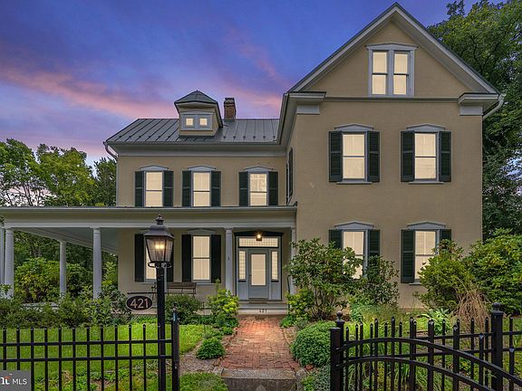 Welcome to 421 South George Street located in the South Charles Town Residential Historic District offering easy walkability to downtown Charles Town. Circa 1868, this lovely center hall Colonial home with a timeless presence, featuring 4 bedrooms and 2.5 bathrooms, offers a gracious and light filled interior sited on a spacious .48 acre fenced yard lovingly landscaped with flowing garden beds and shady walkways under the trees. Renovations to this home from 2021-2024 include a new standing seam metal roof, gutters and downspouts, new wood shutters and new fencing around the property. Updated infrastructure includes a new furnace, 250 gallon oil tank, hot water heater, dishwasher, and two chimneys relined with wood stove inserts installed. The welcoming front façade with the large columned wrap around porch provides generous exterior living space for relaxing and enjoyment. A stunning front entry door, framed with striking multiple paned sidelights and transom, presents to a gracious center hall foyer accessing the main level living spaces and the beautiful front staircase with a carved solid wood newel post and banister. Hardwood flooring, original molding, 6” + base molding, chair rail and 10’+ ceilings run throughout the main level rooms. The spacious living room boasts a relined working fireplace with a wood stove insert and mantle, bay window and French doors to the rear yard and patio. Adjacent is the light filled front parlor or study for separate seating and activity from the living room. The formal dining room with kitchen adjacency, offers a natural light filled room during the day and cozy evening atmosphere with the relined fireplace with a wood stove insert. The kitchen with stainless steel appliances, glass front cabinets and pantry makes meal preparation and access easy with adjacency to the dining room and a sunny breakfast room also with wall mounted glass front cabinetry. Completing the main level is a guest half bath and egress to the two story back porch providing covered access to the kitchen and breakfast room. An adjacent patio offers quiet exterior space for relaxing and gardening. Convenient rear entry to the house is from the private paved driveway off the alley. The second level can be reached by the grand front staircase or the back staircase common to homes of this era. Architectural features of hardwood floors, original moldings, large windows and closed fireplaces with mantles complement the second level. A large primary bedroom provides a tranquil retreat with an en-suite sitting room or office and full bathroom with a ball and claw tub with a shower head. Adjacent to the primary bedroom is access to the second level sleeping porch overlooking the landscaped rear yard. Two other large bedrooms with closed fireplaces and a tiled guest bathroom with separate tub and shower stall complete the second level. The fourth bedroom with hardwood floors and adjacent sitting room resides on the third level with the unfinished attic area providing generous storage space. The laundry area, utilities and storage area are located on the unfinished lower level. Charles Town with a vibrant sense of neighborhood welcomes you to the community and enjoyment of the surrounding areas, seasonal farmers markets, our history, the arts, numerous outdoor activities and the Harpers Ferry National Park. Commuter routes to VA and MD are easily accessible. Schedule your private tour of this lovely welcoming historic home!