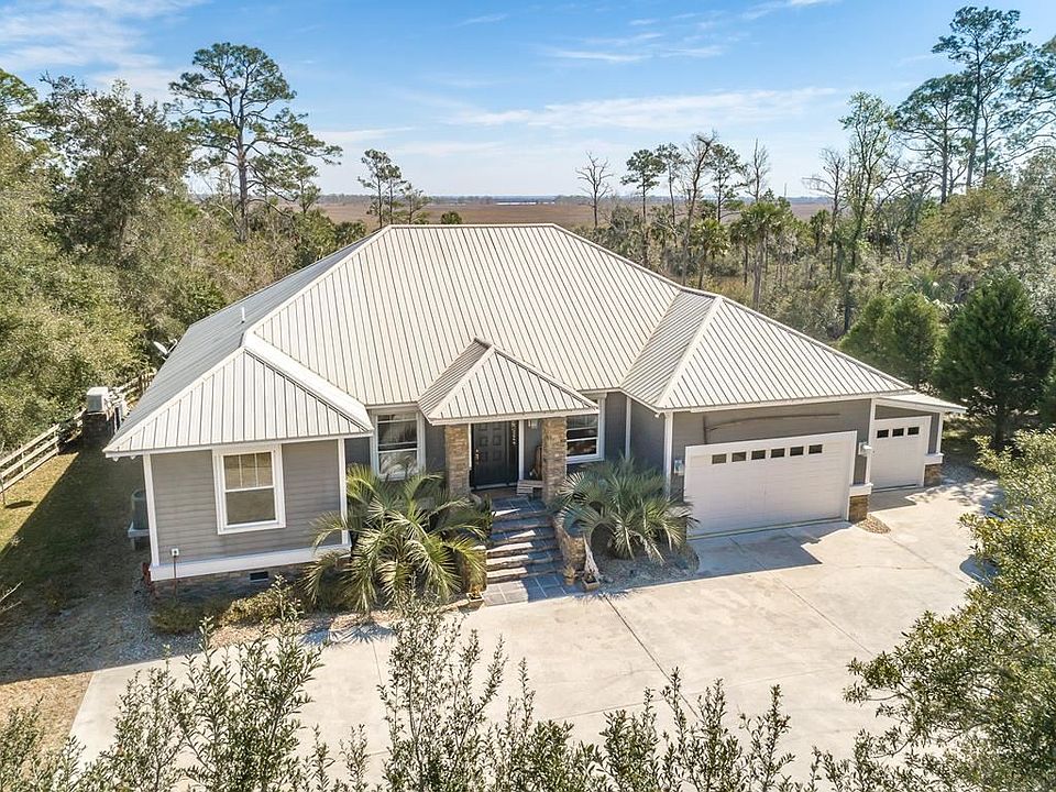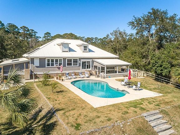 Live your coastal dream on this waterfront country estate north of Apalachicola on 2.49 acres. Breathtaking views overlook marshes on Scipio Creek and the Apalachicola River. This property is designed for outdoor entertaining including a shared boat dock with 6-8 ft water depth. Built in 2008, the spacious 2-story home has 3240 sf of living area, 4 BR/4.5 BA, 3-car garage, 38'x32' pole barn, saltwater pool, whole-house generator, pavillon/storage building. Interior features Brazilian walnut floors and custom cypress trim, granite countertops, tile, 9 ft ceilings. Recent HVAC system. Main level has open floor plan with living-dining-kitchen area, office, separate dining or additional bedroom, 3 masters with ensuite baths, guest bath and laundry. Second floor features sizeable great room, separate bedroom, full bath, large closet.