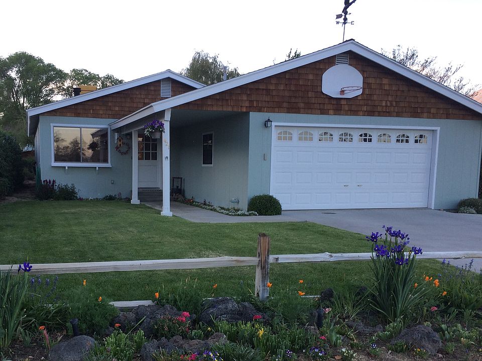 Cozy Cottage. Fruit trees, veggie garden and flower gardens on automatic sprinklers. Deep lot across from open pasture. 3 bedrooms, two baths. Open floor plan in living room, kitchen and dining area so life can flow easily from one to the other. Remodeled kitchen and baths. Wood stove, f/a heating, double pane windows with R30 ceiling insulation for conservation of heat and cool. 2 car garage with extra storage. More storage in the detached shed.