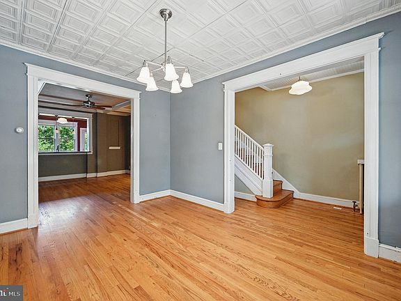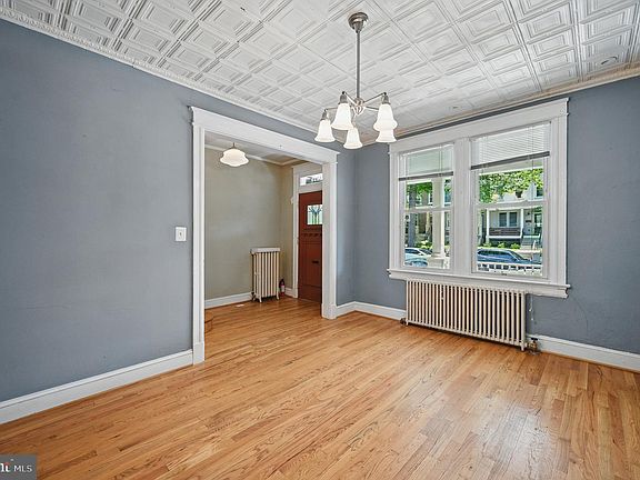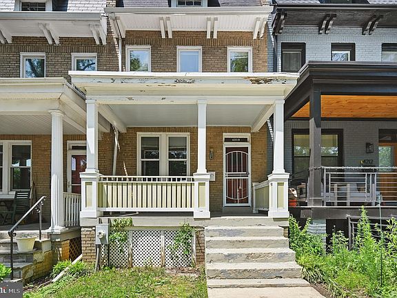 Welcome to 4210 3rd St NW, a spacious rowhouse perched high atop Petworth with sweeping western views—ready for your vision and offering a perfect condo alternative. The main level features a covered front porch overlooking a garden-ready yard, an entry foyer, a spacious living room with a tin ceiling, and a separate dining room with built-ins. The efficient U-shaped kitchen opens to the dining room and overlooks the large rear deck, which leads down to a brick patio. A convenient powder room completes this level. Upstairs, you'll find a large front bedroom with three windows, two additional bedrooms, and an enclosed bonus room connecting both—offering stunning western views stretching from the Washington Monument to the National Cathedral. The hall bathroom includes a dual vanity. The lower level offers bonus living space with a built-in bar, ample storage, a laundry area, a powder bath, and a separate storage room. A detached one-car garage sits at the rear, and the home is equipped with radiator heat and high-velocity central A/C.