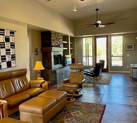 Sellers will entertain offers between $699,000-$719,000. Superb contemporary with clean lines and open floor plan. Distressed colored concrete floors add to the overall warmth and character. Stacked stone gas fireplace is a striking focal point in the living area. Stainless appliances, granite tile countertops, generous storage plus walk-in pantry. Enjoy the spa tub & separate luxury shower in the primary bedroom w/private patio. Open living flows seamlessly into the backyard overlooking a gorgeous PebbleTec infinity pool & spa. Cozy outdoor fireplace w/banco seating, BBQ set in bar counter for entertaining. This custom home sits on a hill w/mountain & sunset views. River Walk/Loop and multiple amenities. Top it off w/a spacious 3 car garage w/storage. Solar system is owned.