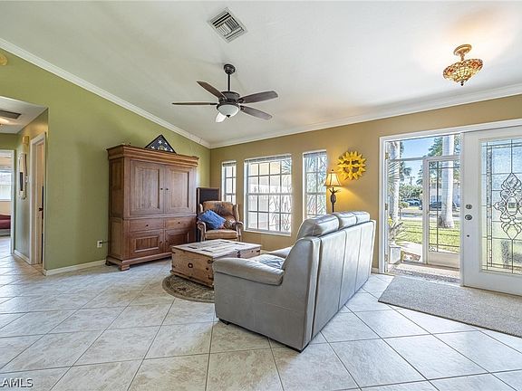 Welcome to SE Cape Coral! This fabulous 3 bedroom 2 bath home is located in an established and desirable area of Cape Coral. Beautiful Royal Palm Trees line the entryway to the home. Many nice features include etched glass double doors which allows plenty of light in, vaulted ceiling, crown molding, and tile throughout makes cleaning so much easier. Enjoy your mornings and nights in the beautifully paved open patio surrounded by mature landscaping. The property is on city water with ALL ASSESSMENTS PAID!! Walking distance to downtown Cape Coral shopping and dining. This is true Florida living! Make this your home!