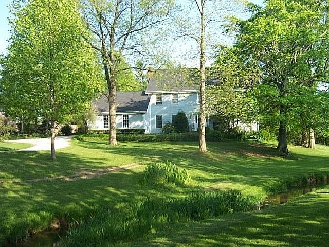 Beautiful 4 BR/2.5 bath home with partially finished walk-out lower level in a private, park-like setting of 2.3 acres with views of the woods, ponds and a small stream. Inside you will find both formal and informal living areas: eat-in kitchen with breakfast bar and all appliances, formal living room, formal dining room, 2 family rooms and 2 office areas. Main level family room fireplace has gas starter. Lower level family room (24x14) has decorative gas stove. Outside are TWO 2-car garages: one attached, one detached. The detached garage has a heated workshop and a 3/4 bath. Realtor owned.